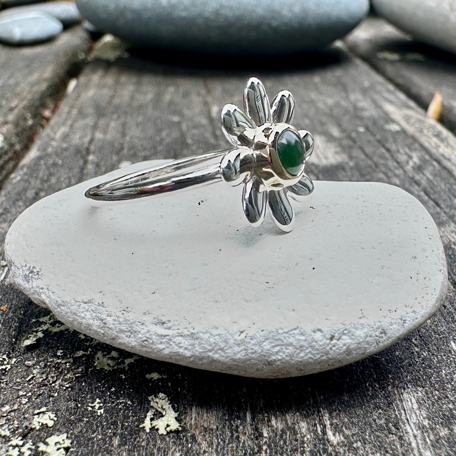 Beautiful little sterling silver & pounamu puāwai ring with a 9 carat gold bezel. Puāwai translates to flower.