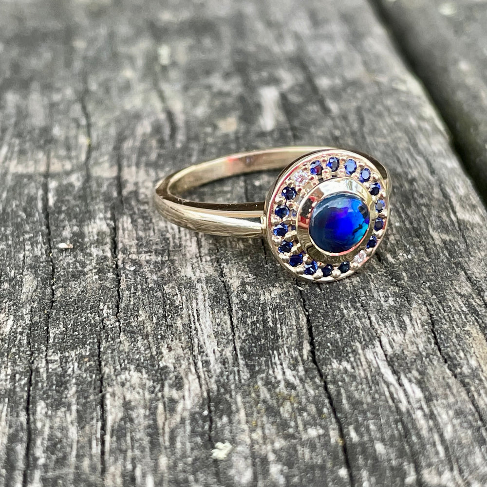 9ct Gold, Opal, Sapphire, and Diamond Halo Ring