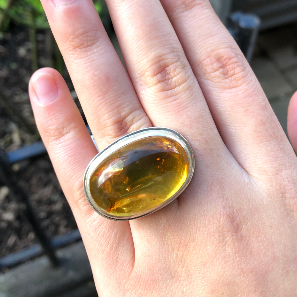 This gorgeous large oval piece of natural Baltic amber has been set horizontally, creating an unconventional and completely unique ring design. A beautifully bright cognac colour, with fascinating and unique inclusions that catch the light at different angles. This piece makes for a beautiful statement ring for that outgoing person who loves something a bit different!