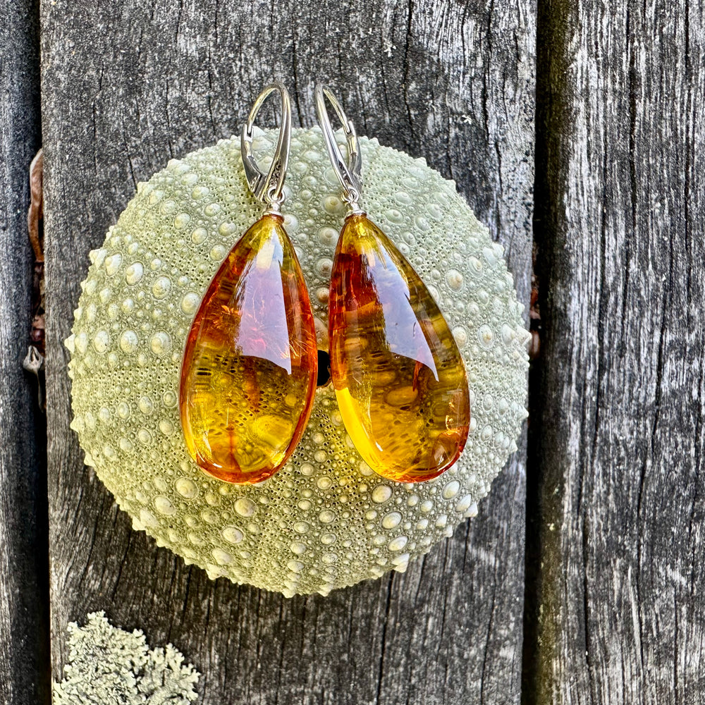 Long and lovely light filled Baltic amber drop earrings with sterling silver leverbacks.