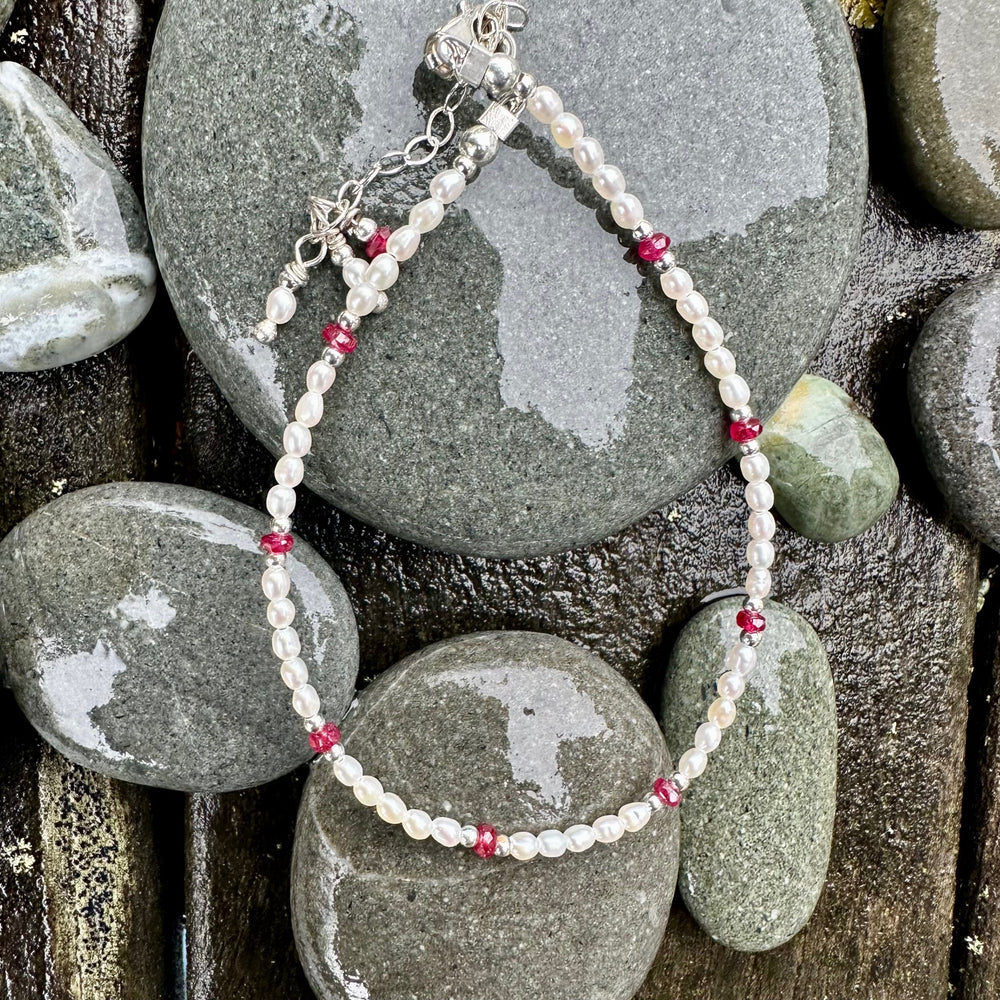 very pretty and tiny white freshwater pearl bracelet with equally tiny rubies and quality sterling silver findings & spacers.