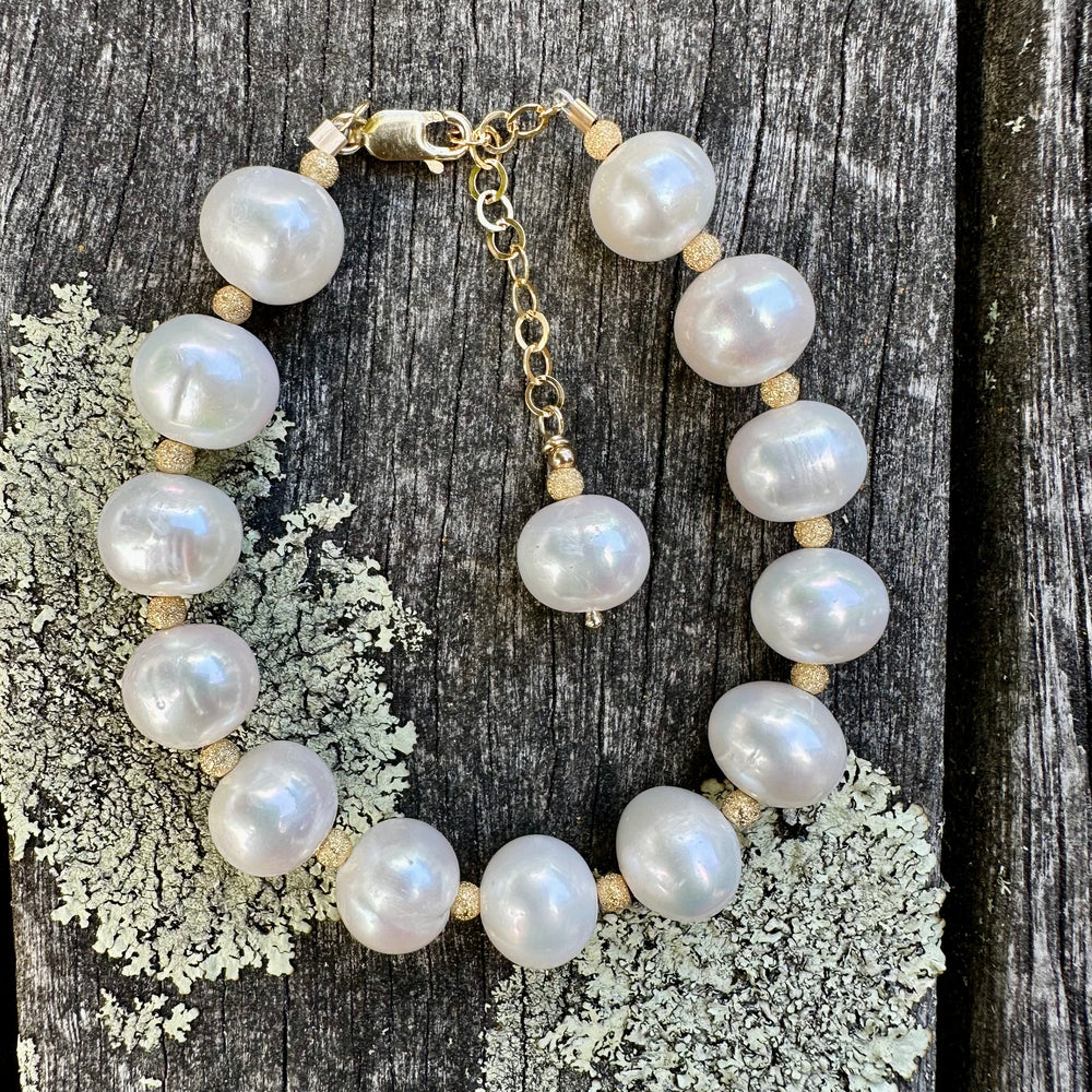 10mm x9mm white freshwater pearl bracelet with yellow gold fill spacers and findings.