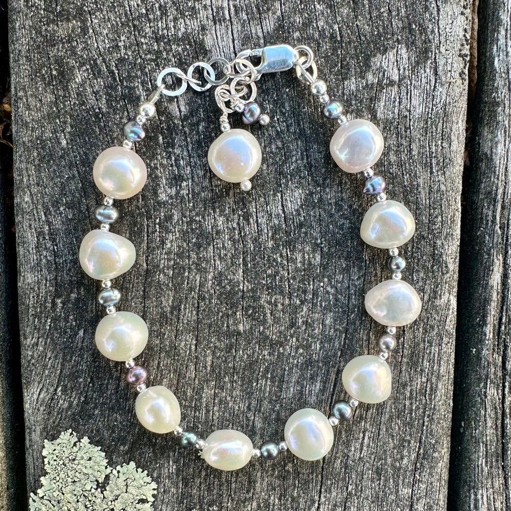 White double shiny freshwater pearls with tiny peacock pearls and sterling silver findings