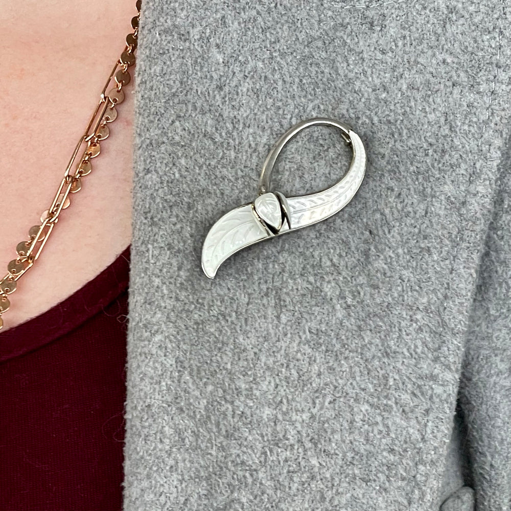 A gorgeous collectable vintage enamel brooch designed by Aksel Holmsen. A white lily of the valley resting on a similar white leaf. Such a simple design that somehow feels very contemporary despite its true age.