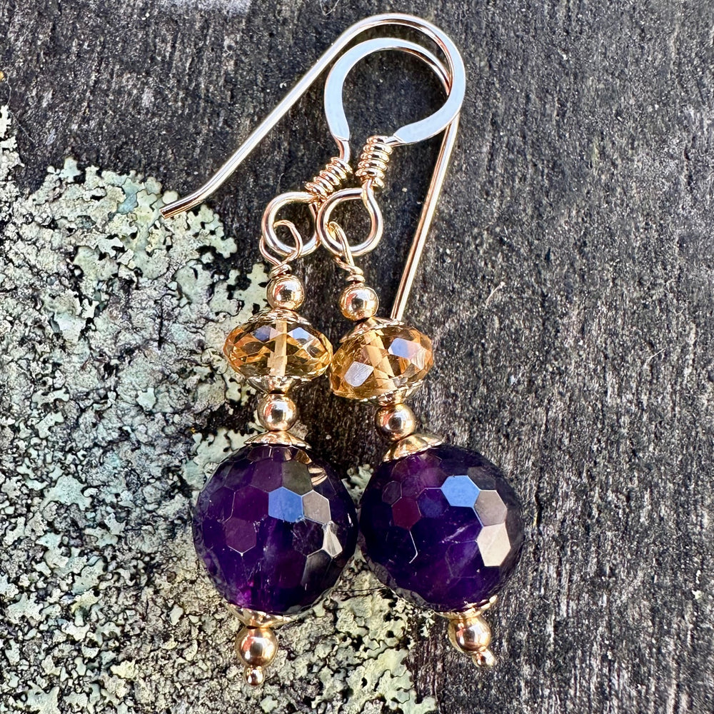 Faceted amethyst & citrine earrings with quality yellow gold fill spacers, caps & findings.