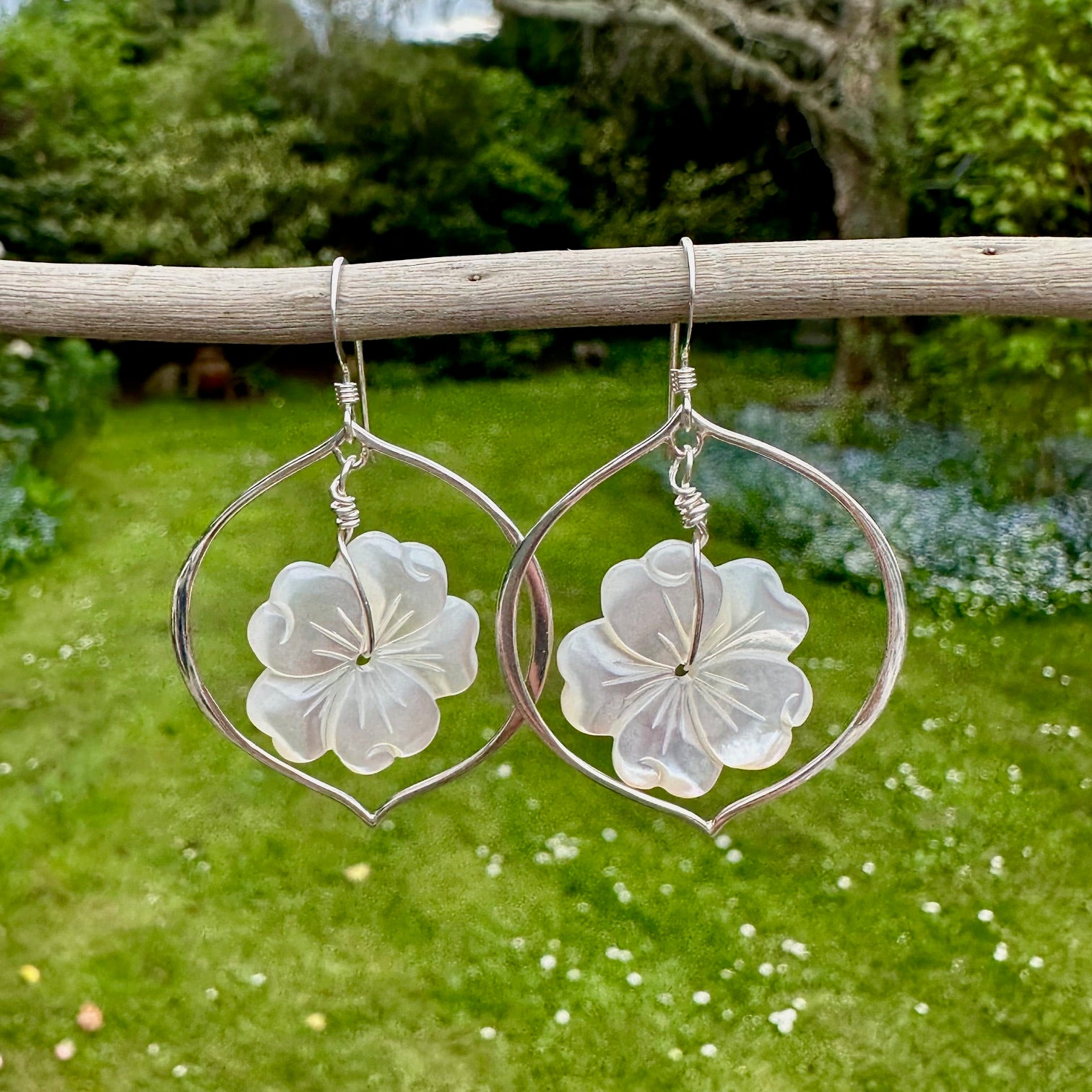 Large carved mother of pearl earrings in a sterling silver arabesque hoop