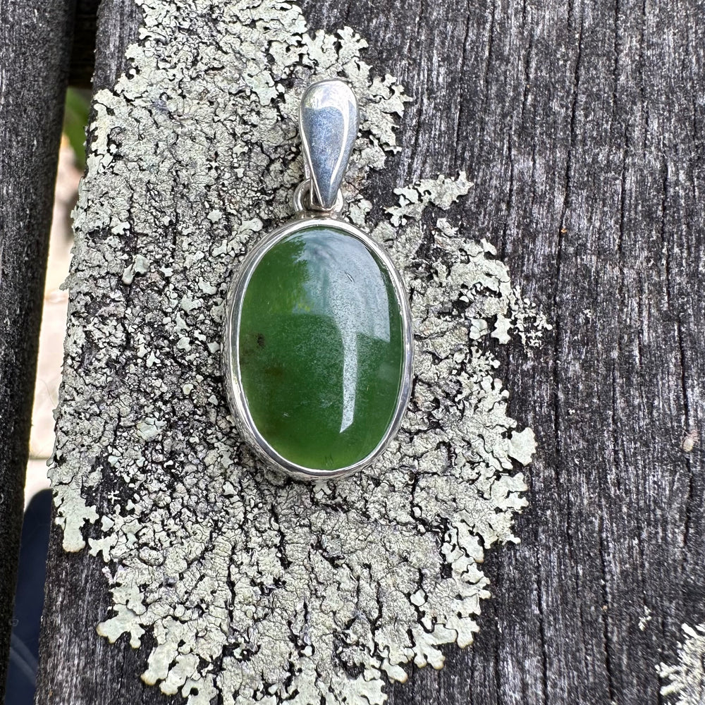 13mm x 30mm oval New Zealand greenstone pendant in sterling silver.