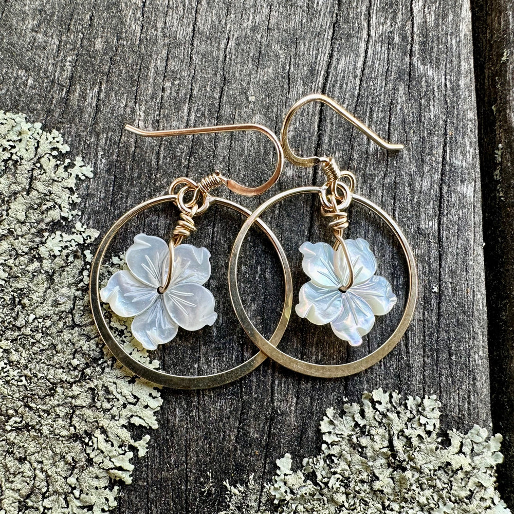 white carved mother of pearl flowers with yellow gold fill hoops.