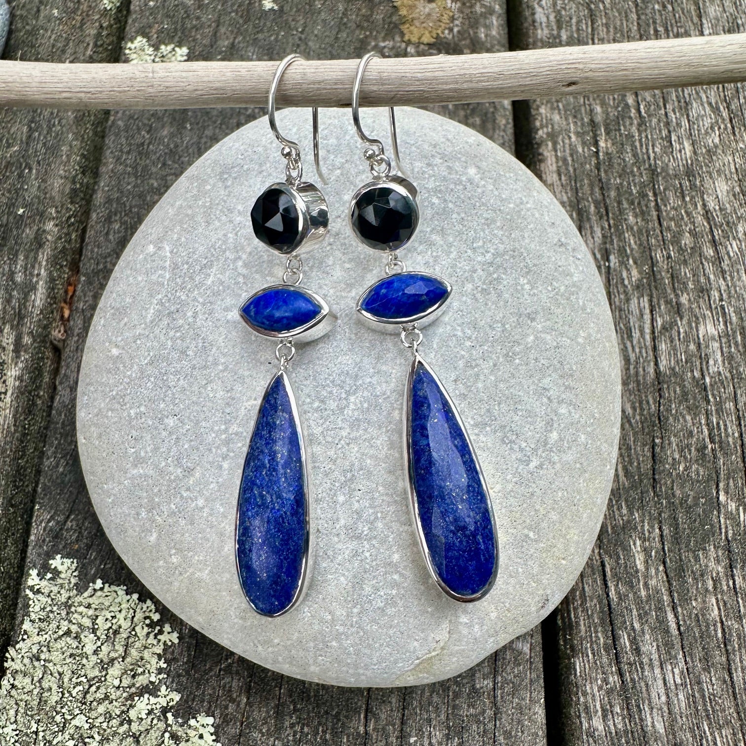 Long faceted Lapis lazuli & black onyx earrings set in sterling silver