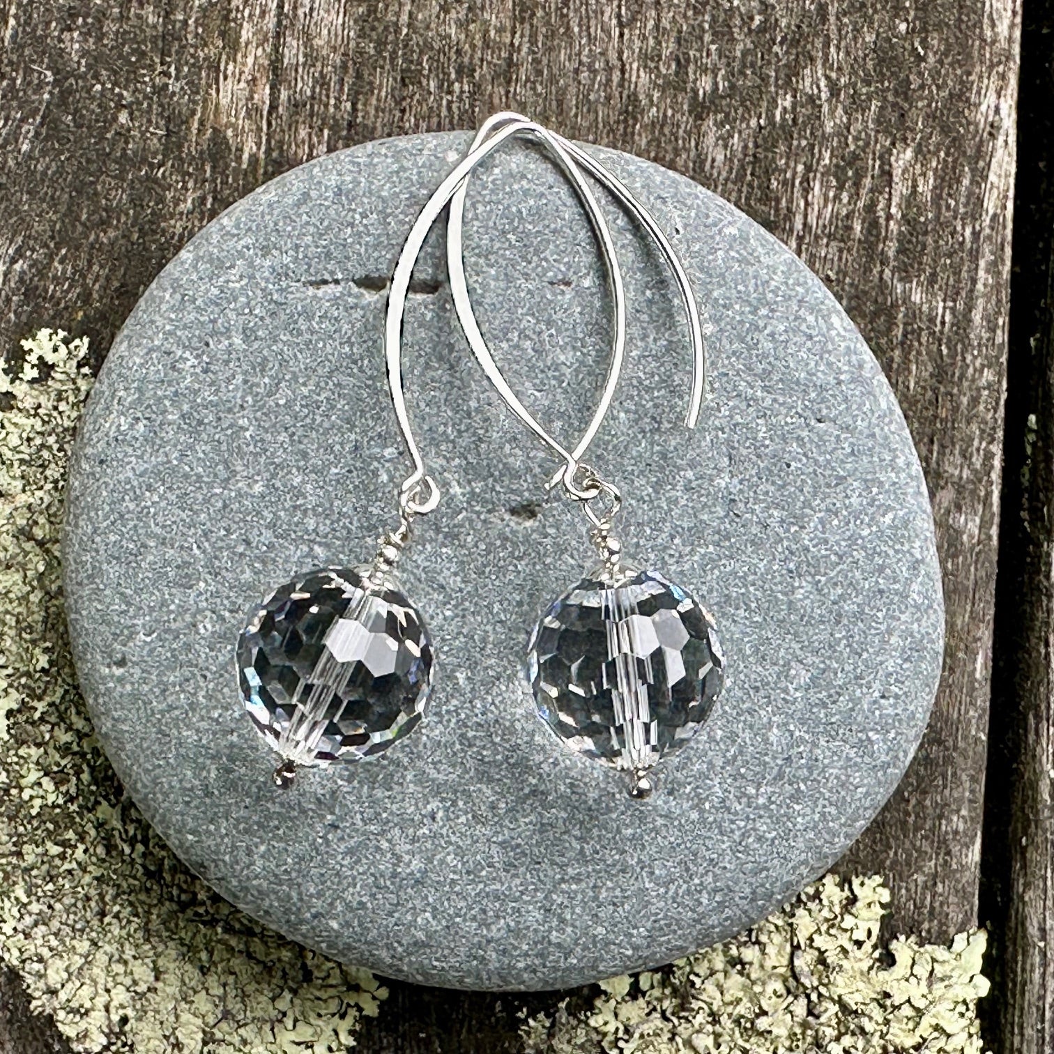 13mm rich cut swarovski crystal on sterling silver marquis hooks.