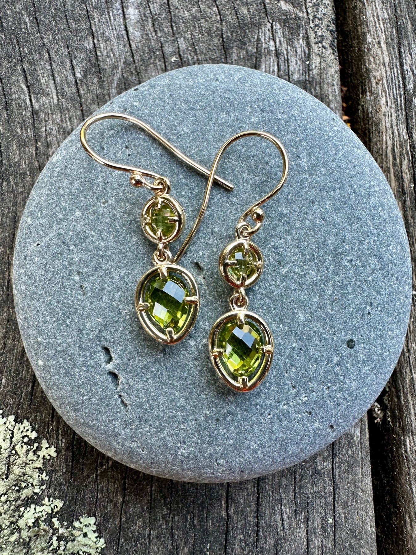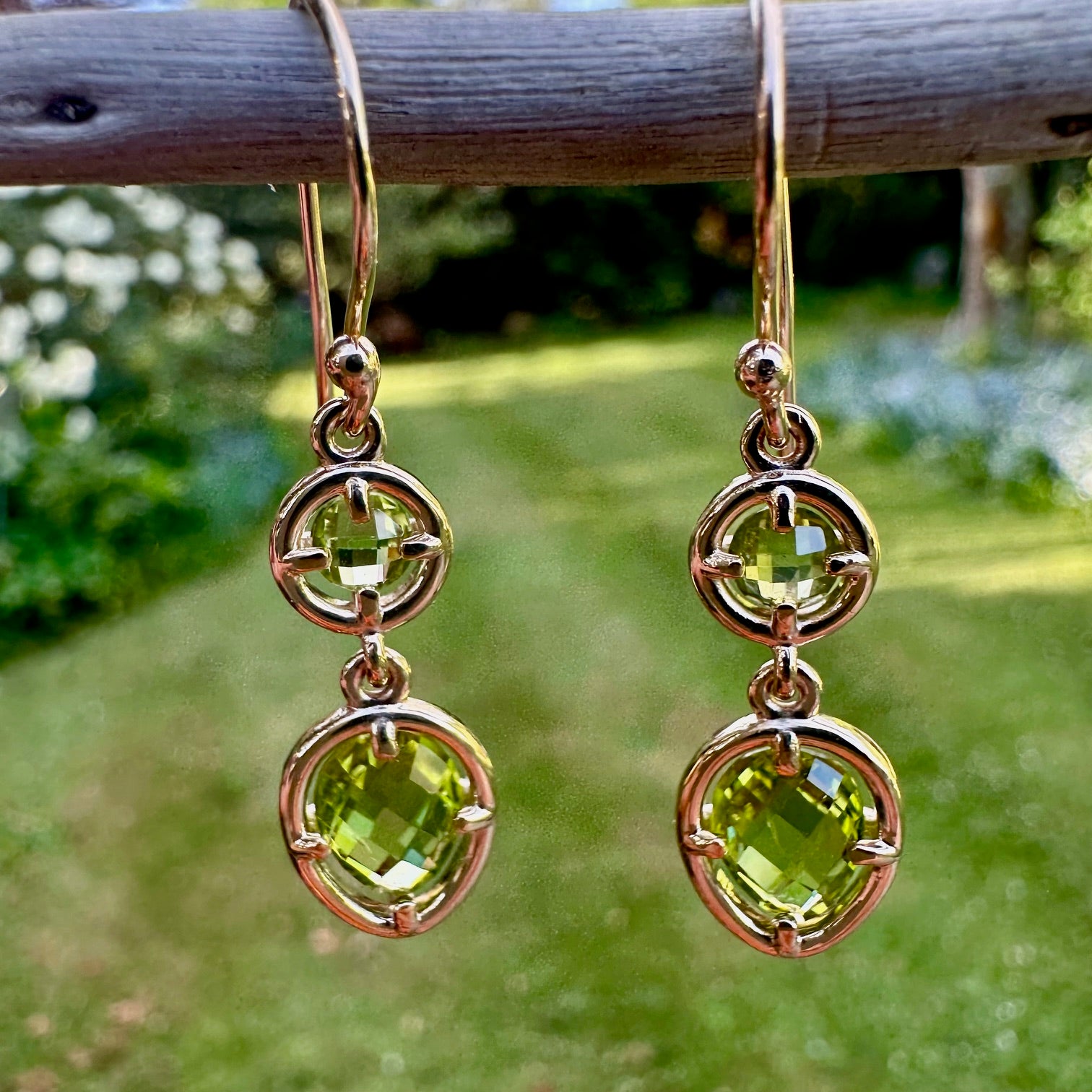 Two tier rose cut peridot earrings claw set in 9 carat yellow gold.