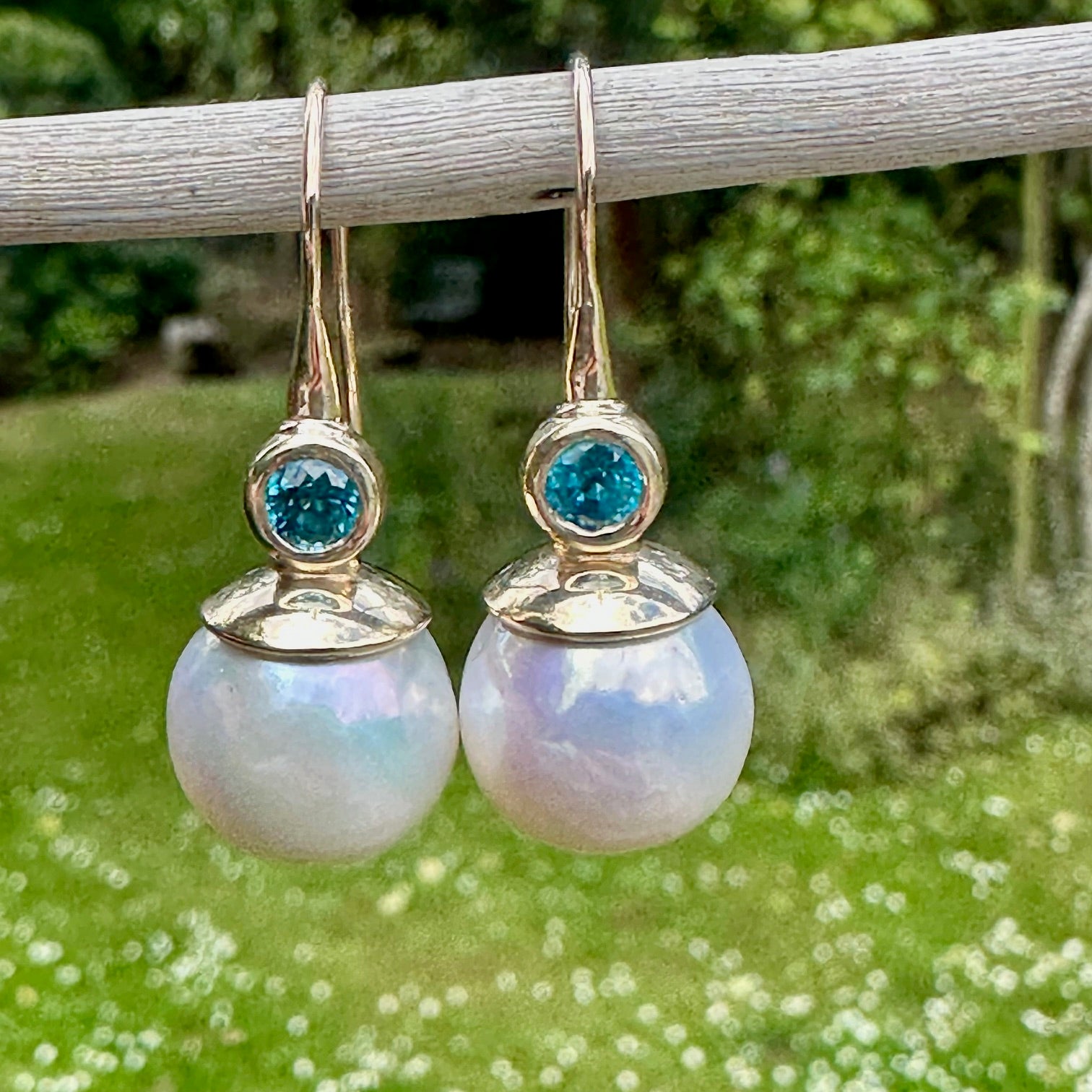 Gorgeous unique pair of freshwater pearl & Cambodian zircon (1.16ct) set in 9 carat yellow gold.