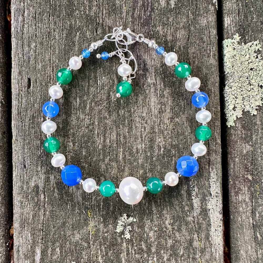 Green and blue onyx bracelet with freshwater pearl and quality sterling silver spacers and fittings