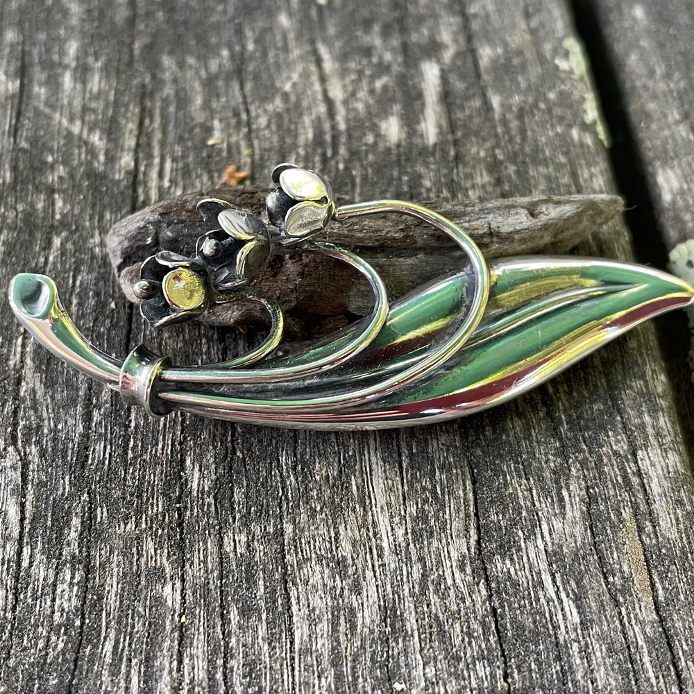 Vintage Erik Granit (Finland 1950s) sterling silver lily of the valley brooch. This is a gorgeous example of mud century sterling silver with a beautiful flower and leaf brooch with a lovely pull out safety clasp.