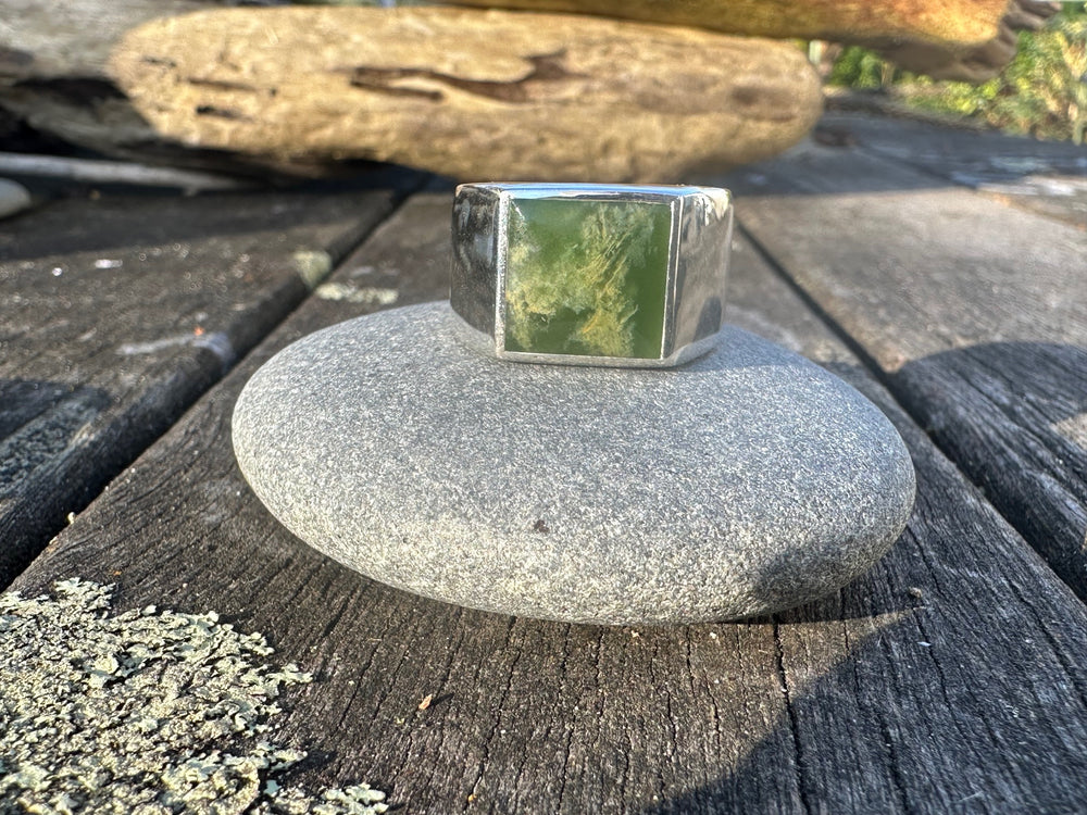This heavy sterling silver signet ring has been set with a gorgeous square piece of Marsden flower greenstone. This is a clean and simple design with a weighty, quality feel. We always have stock of hese rings and each piece of Pounamu is different so message us for availability and we can send photos and size of what we have in stock