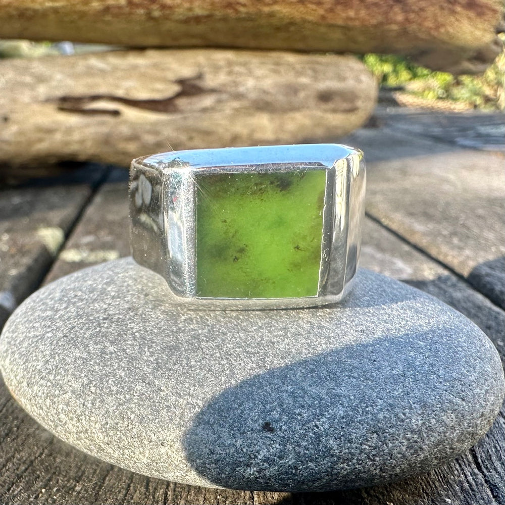 This very heavy duty and weighty signet ring has been set with a colourful square Marsden Flower pounamu cabochon or a dark square of New Zealand greenstone. A simple design with a quality feel.
