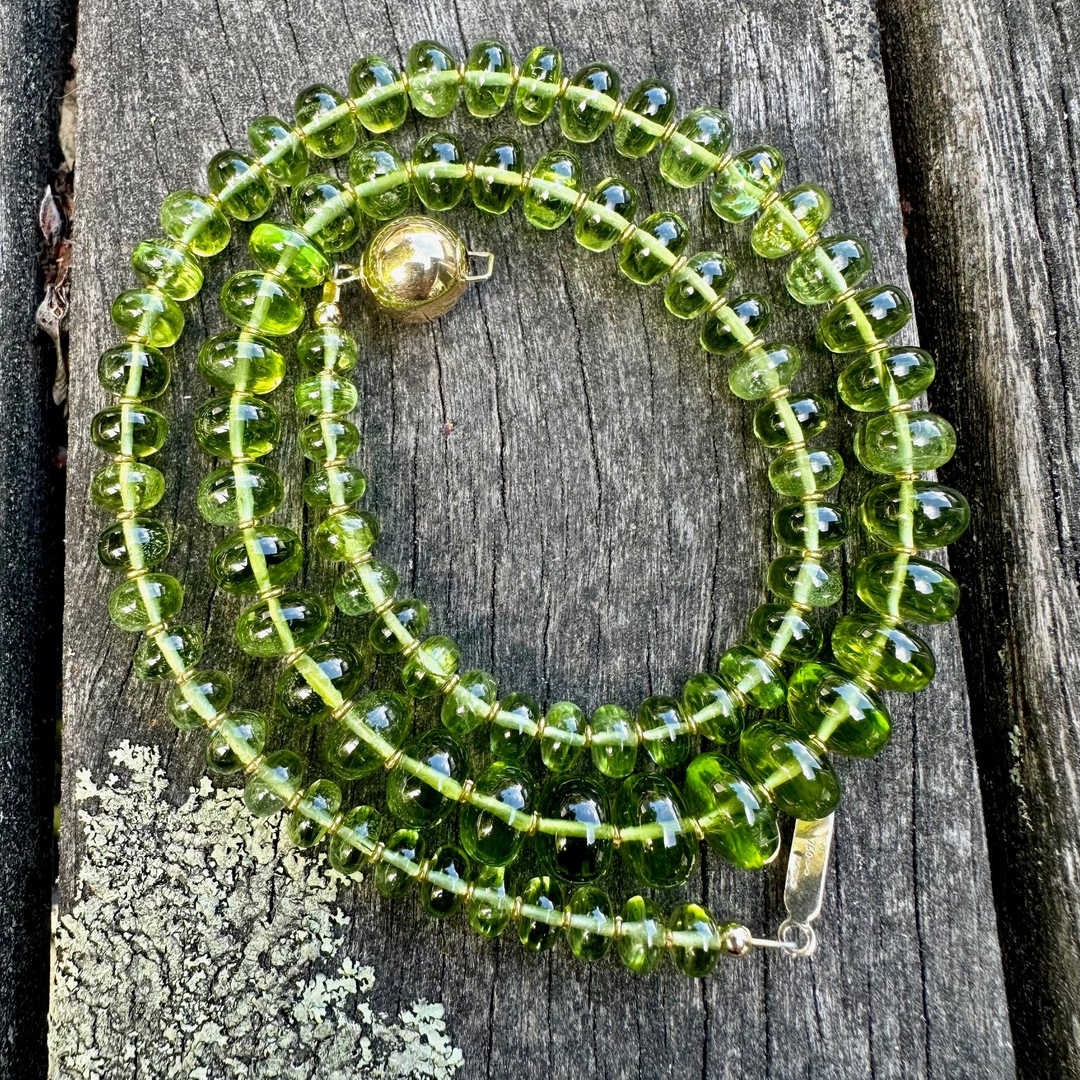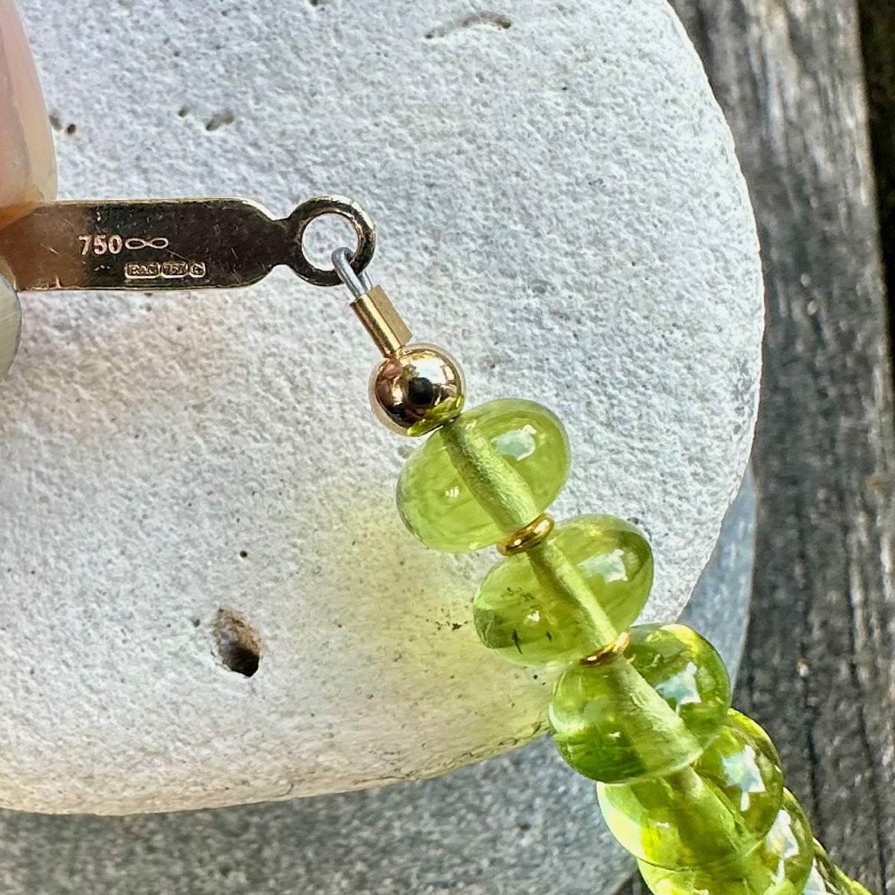 This gorgeous necklace is a graduated peridot rondel necklace with 18ct yellow gold spacers & clasp.