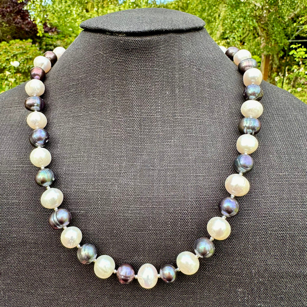 Large white (11mm) and peacock (9mm) freshwater pearl necklace with sterling silver spacers.