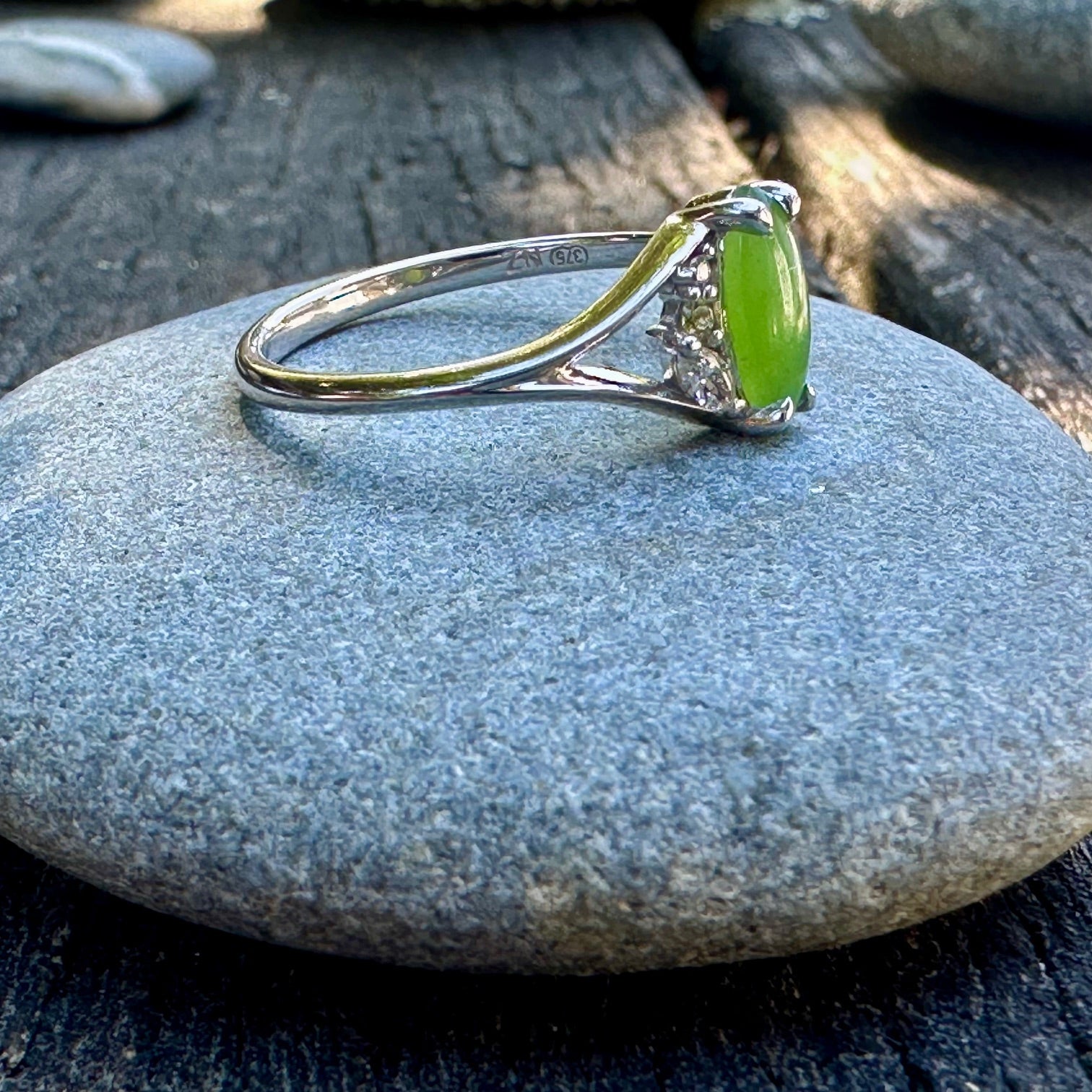 Im in love with how this ring has turned out. Its a vibrant green marquise pounamu (NZ Greenstone) surrounded by marquise diamonds & peridot & set in 9ct white gold with rhodium plating.