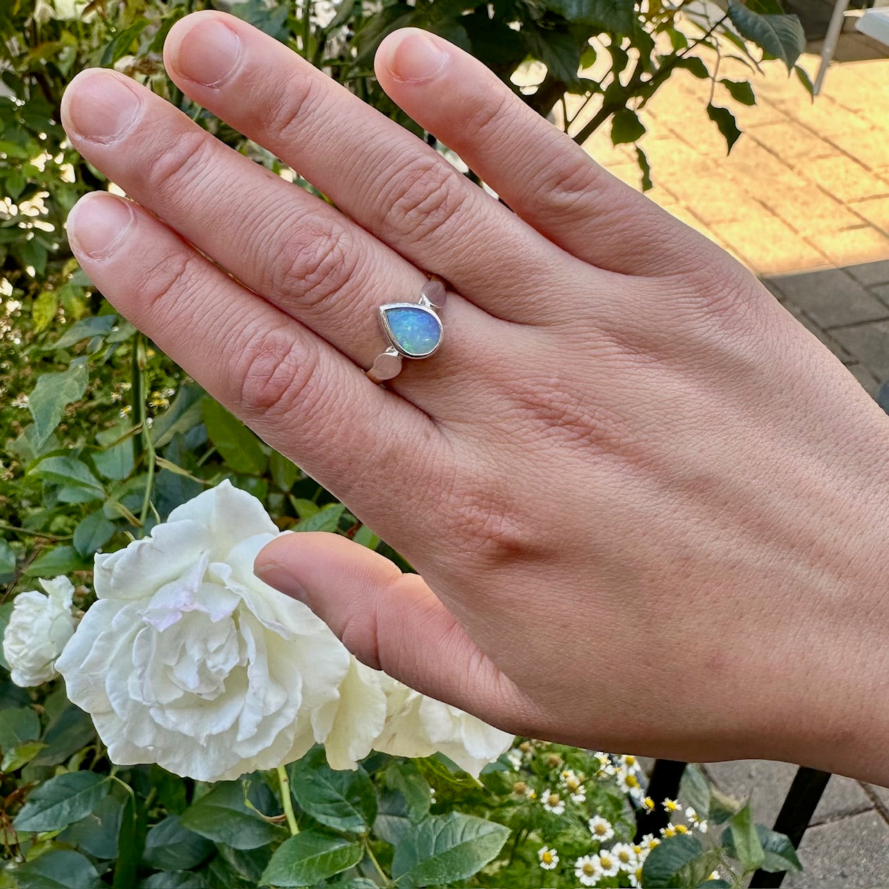 This beautiful .95ct pear Australian crystal opal ring is set in a 9 ct White & yellow Amore ring.