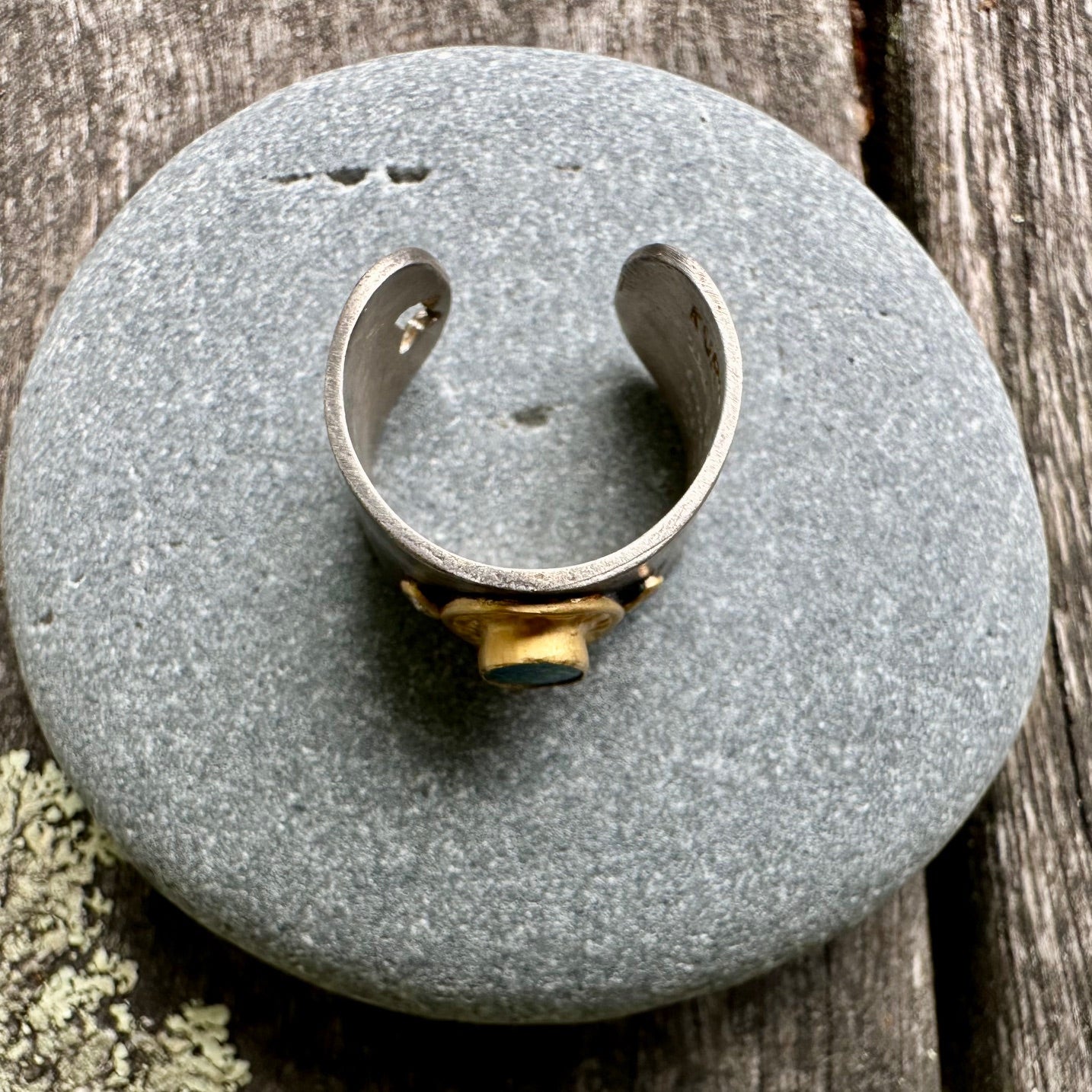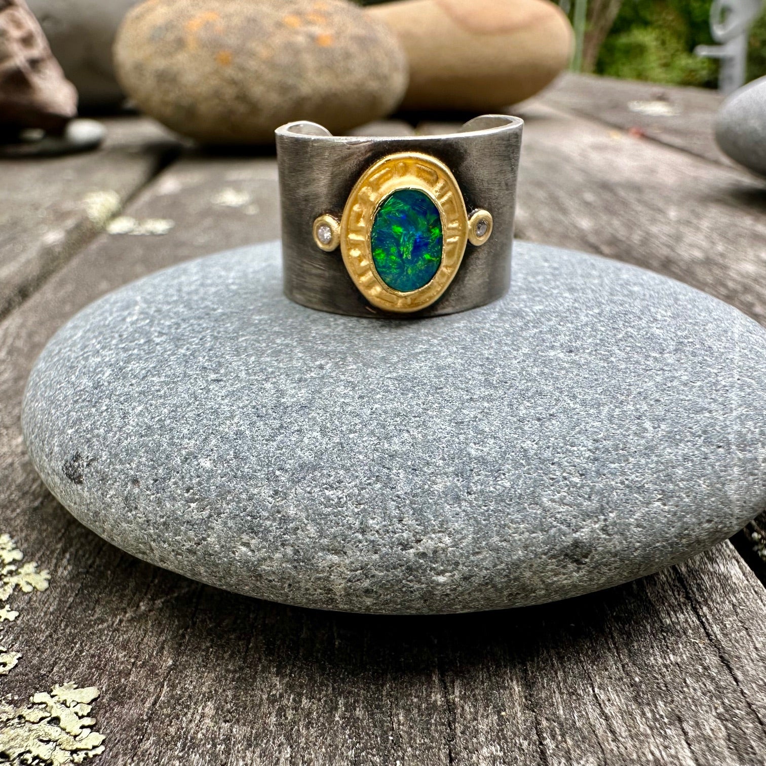 This is my last piece from my Kurtulan collection. Kurtulan is a Turkish family company who have won the European gold awards. This ring mixes sterling silver & 24ct gold with an opal doublet & diamonds. The ring has an open back.