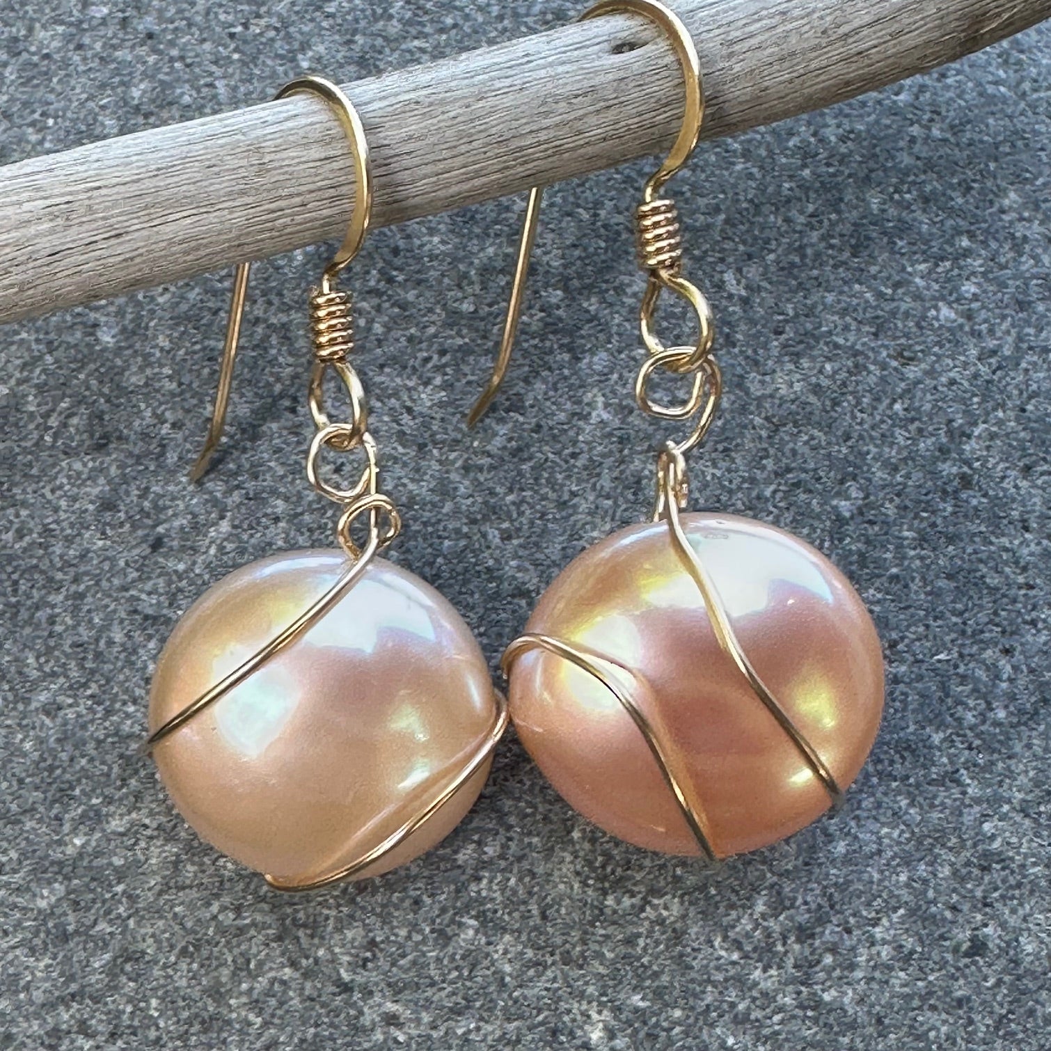 Apricot freshwater coin pearls wrapped with yellow gold fill.