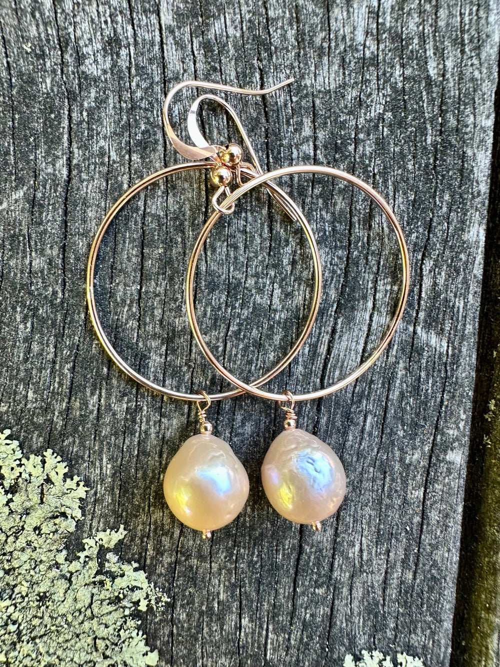 Baroque apricot freshwater pearls in rose gold fill hoops.