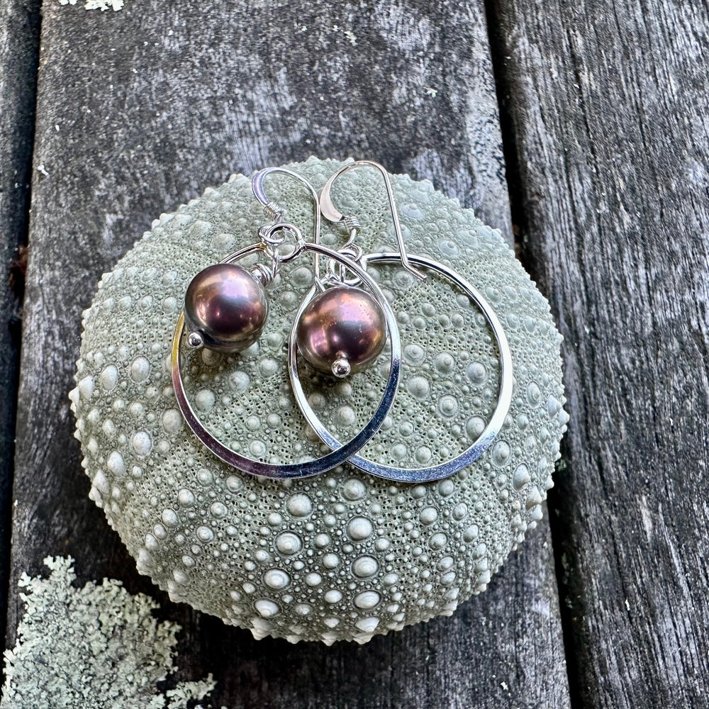 coffee coloured freshwater pearl earrings in a sterling silver hoop.