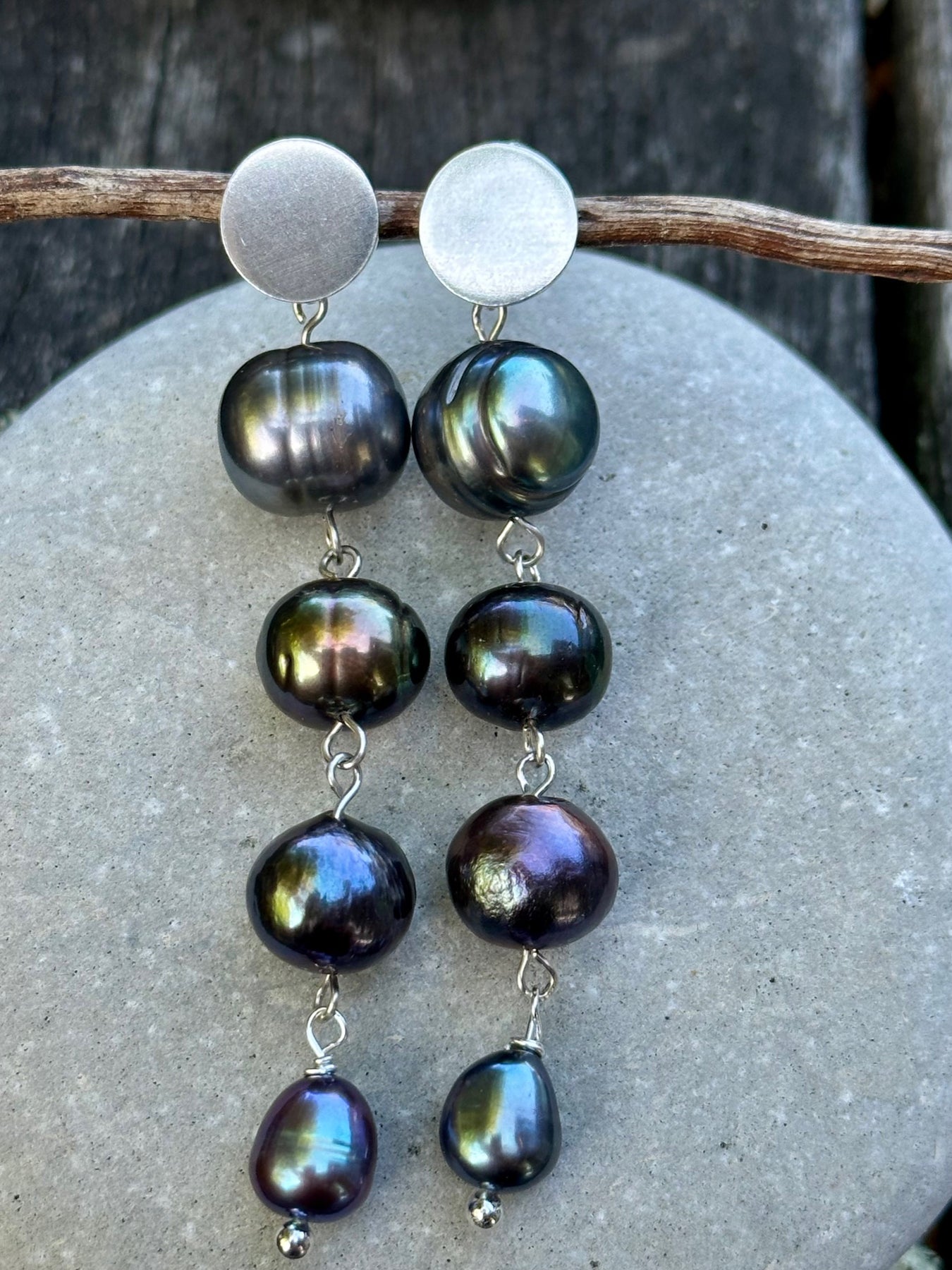 Inverted 4 tier peacock freshwater pearl earrings with a round sterling silver stud.