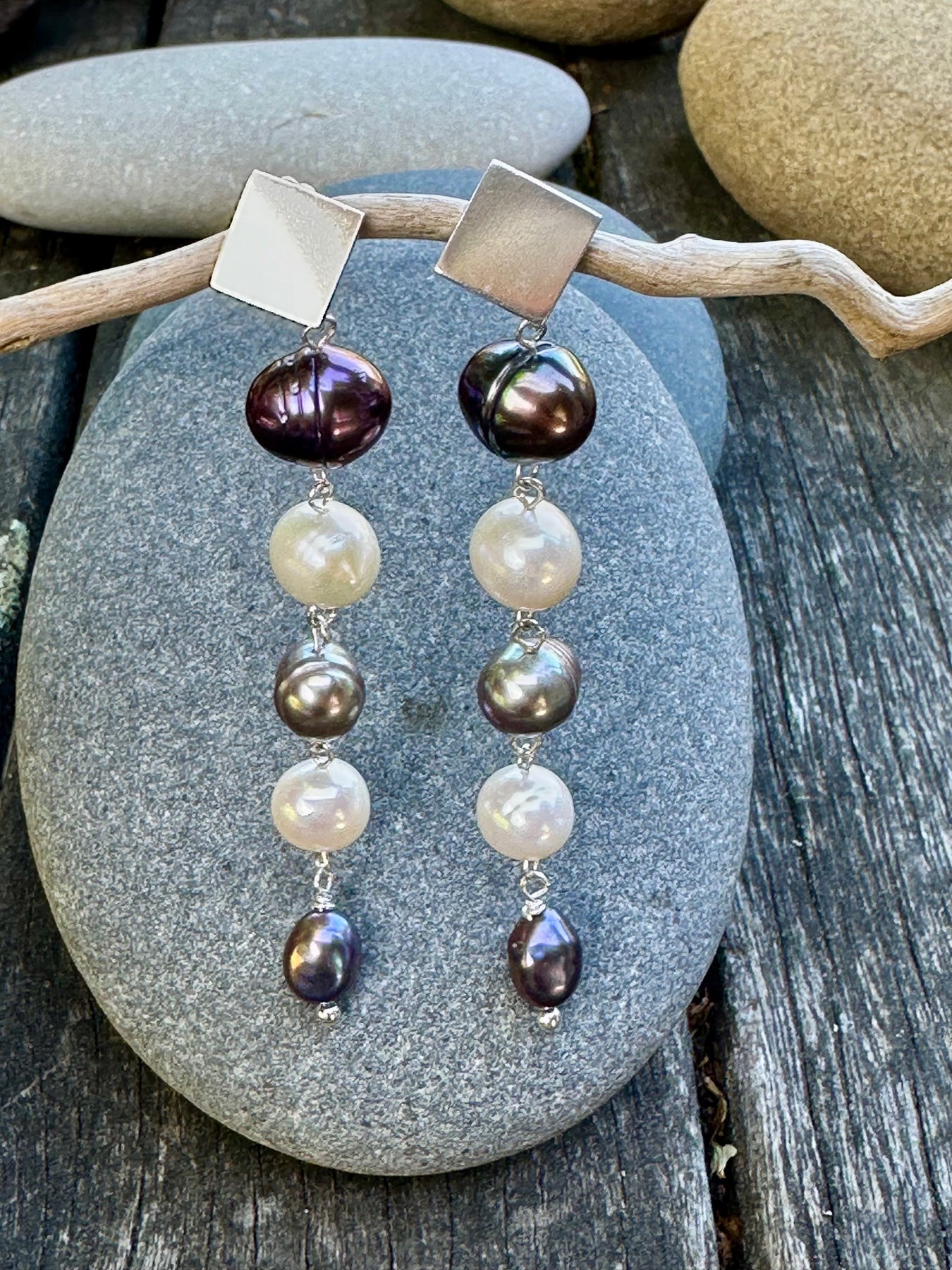 Gorgeous 5 tier white & peacock freshwater pearl earrings in sterling silver with a diamond shaped sterling silver stud top.