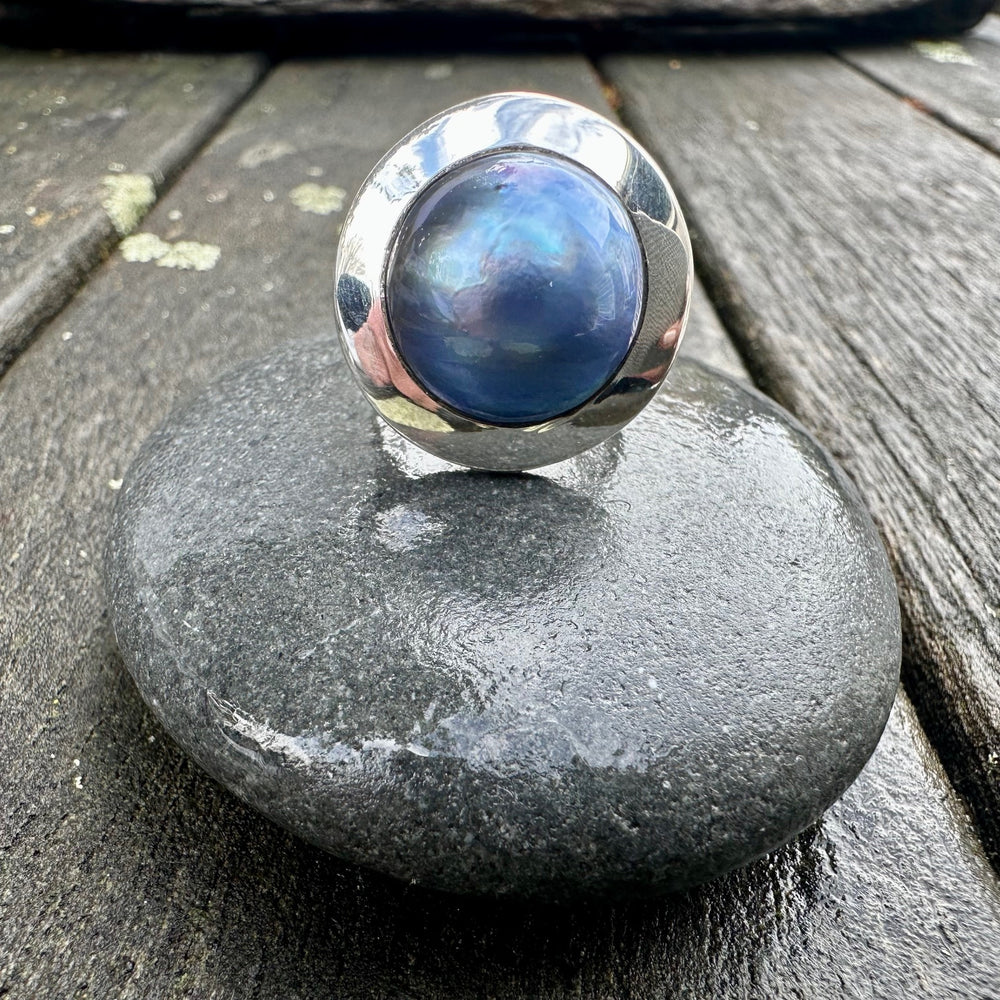 beautiful highly coloured peacock mabe pearl in sterling silver ring with a double band