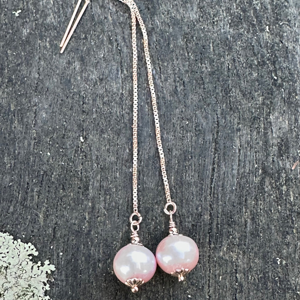 Pink freshwater pearl earrings on rose gold fill earrings threads.