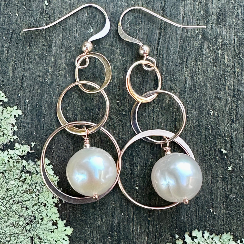 White freshwater pearl earrings in rose gold fill triple hoops.