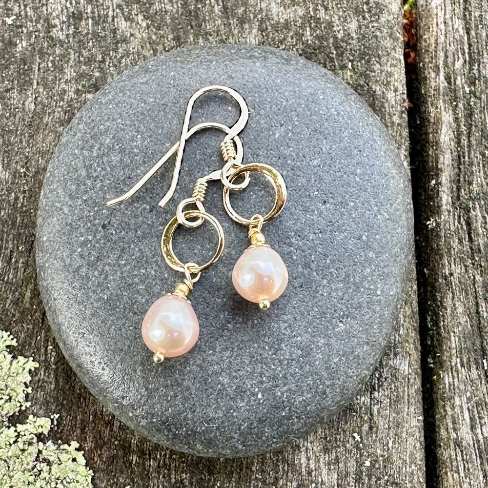 wee pink freshwater pearl drop earrings in yellow gold fill and with a wee hoop.