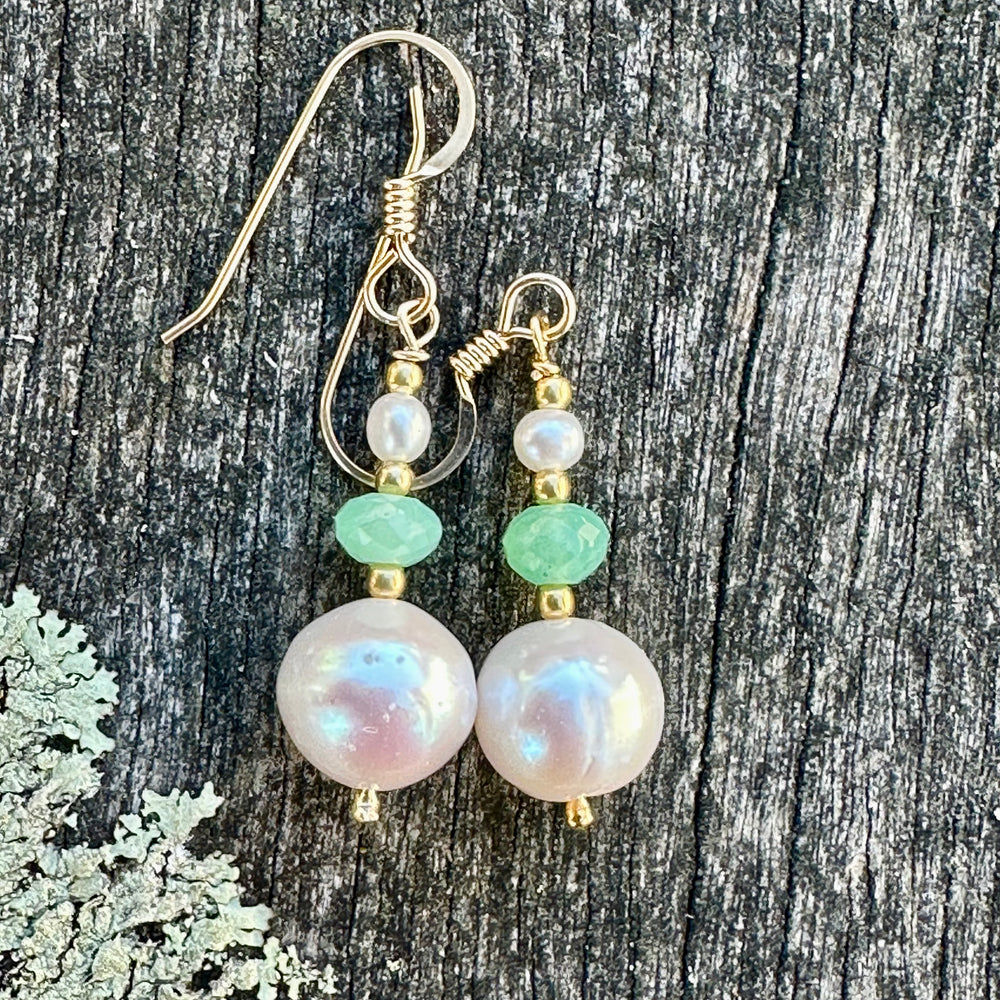 3 tier white freshwater pearl earrings with peruvian opals on yellow gold fill findings.
