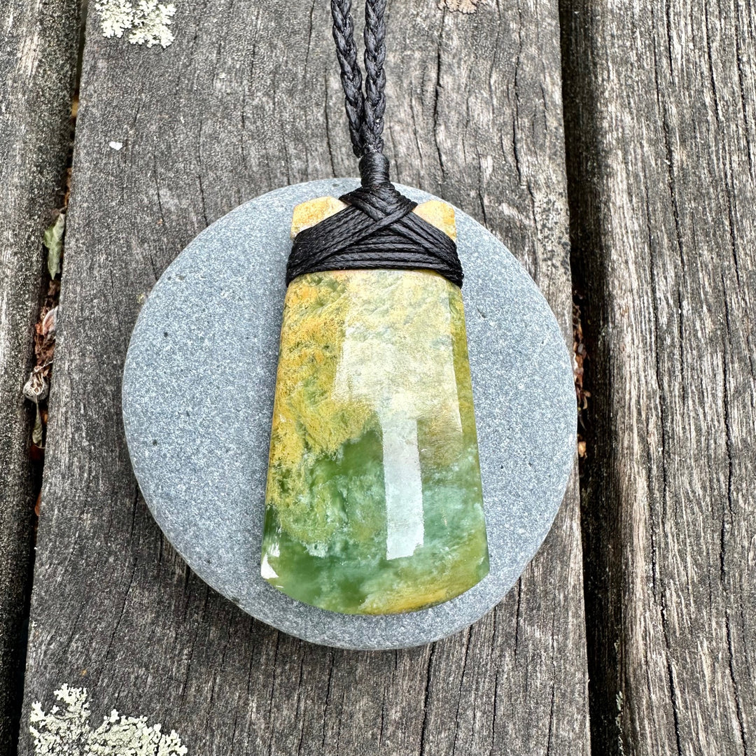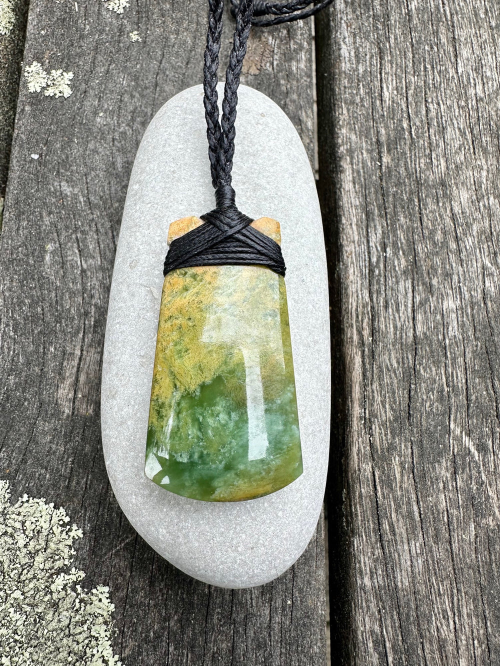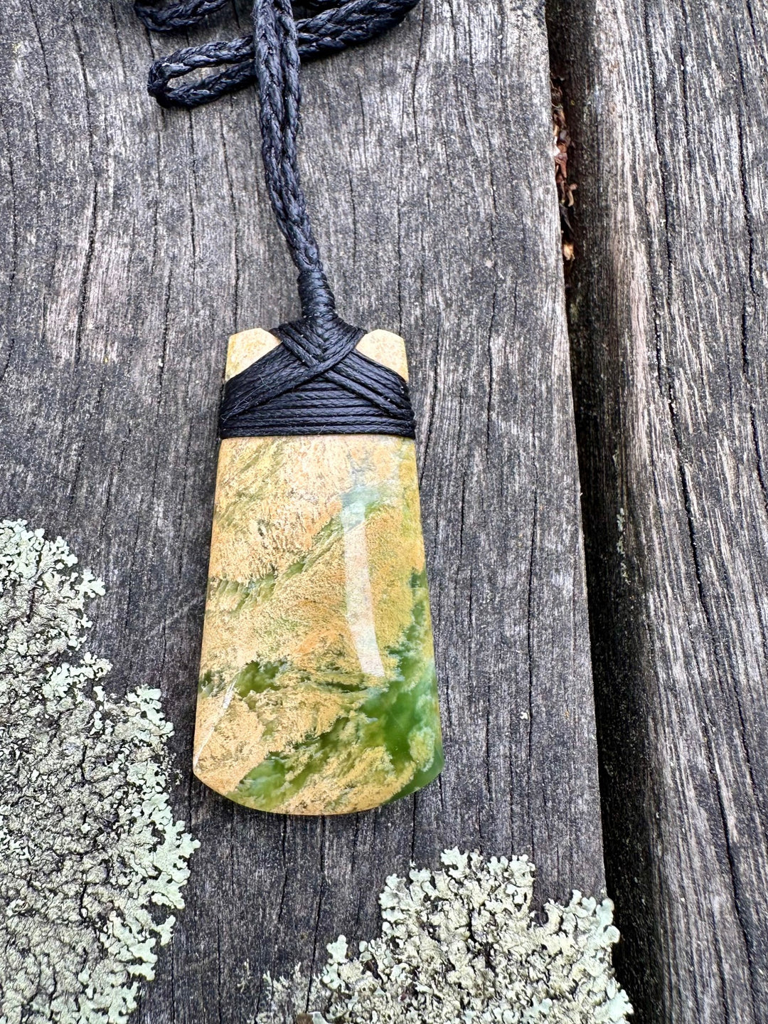 All our pounamu carvers are incredibly talented. Jeremy has been carving since he was 12 and his collection of pieces with Marsden Flower is sublime. This pounamu comes from the Greymouth area of the West Coast. Jeremy cuts the stone to incorporate the colour into the piece and he often has a highly polished finish which adds beauty to the whole carving.