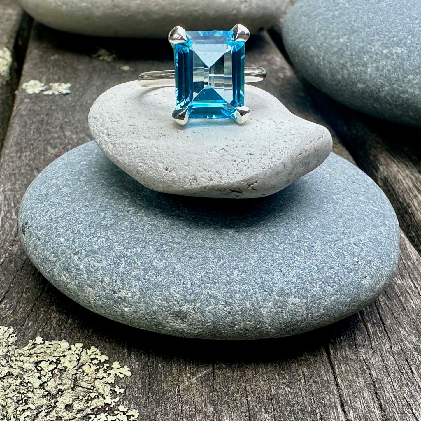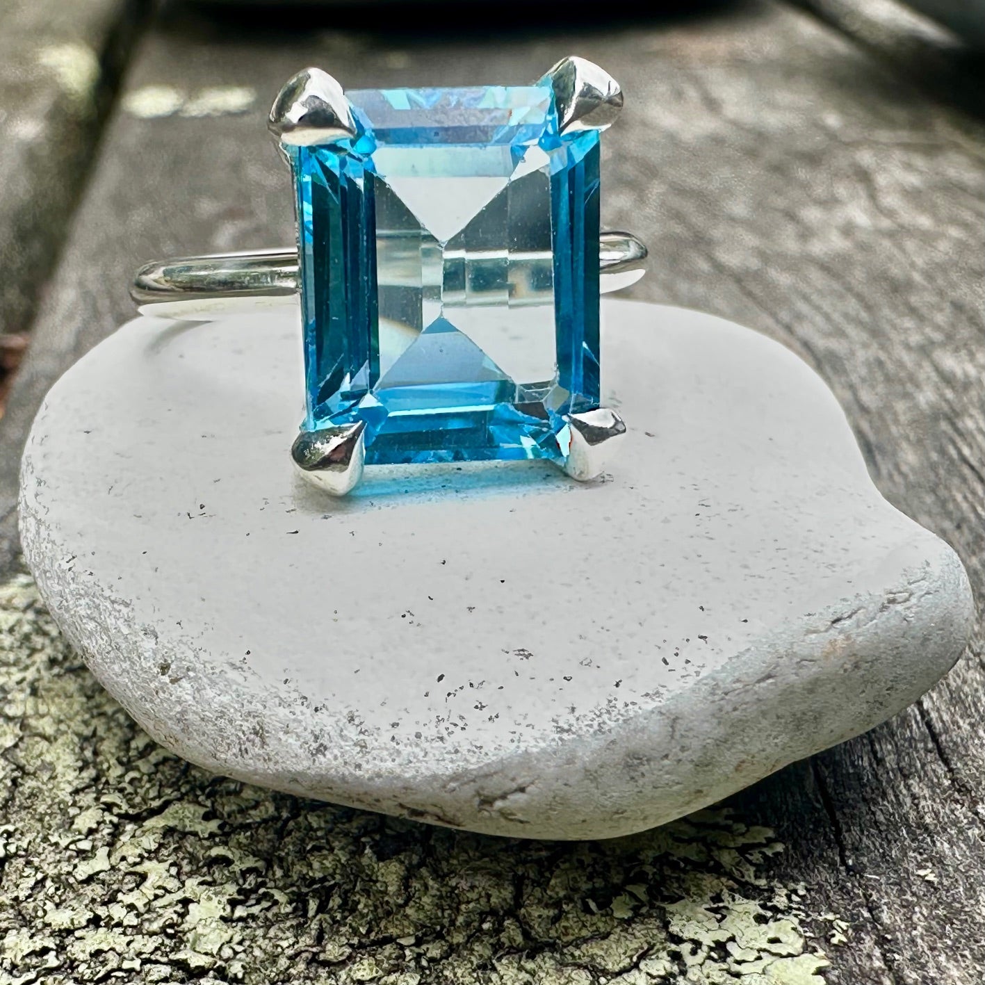 beautiful 6.3ct emerald cut swiss blue topaz ring in sterling silver.