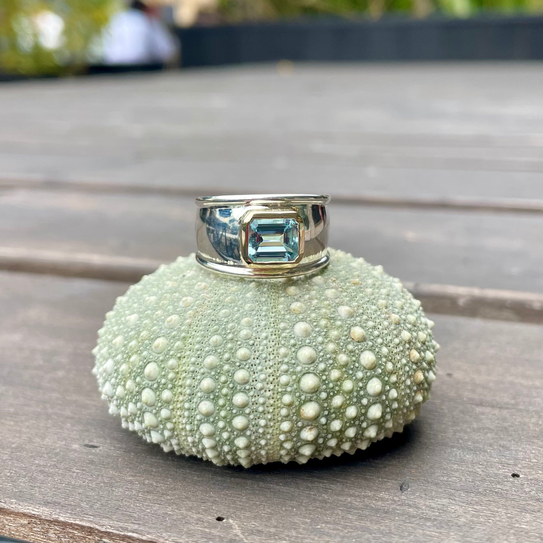 Aquamarine Bella ring. This is a sterling silver wide band with a 1.7ct Brazilian aquamarine set in a 9 ct yellow gold bezel.