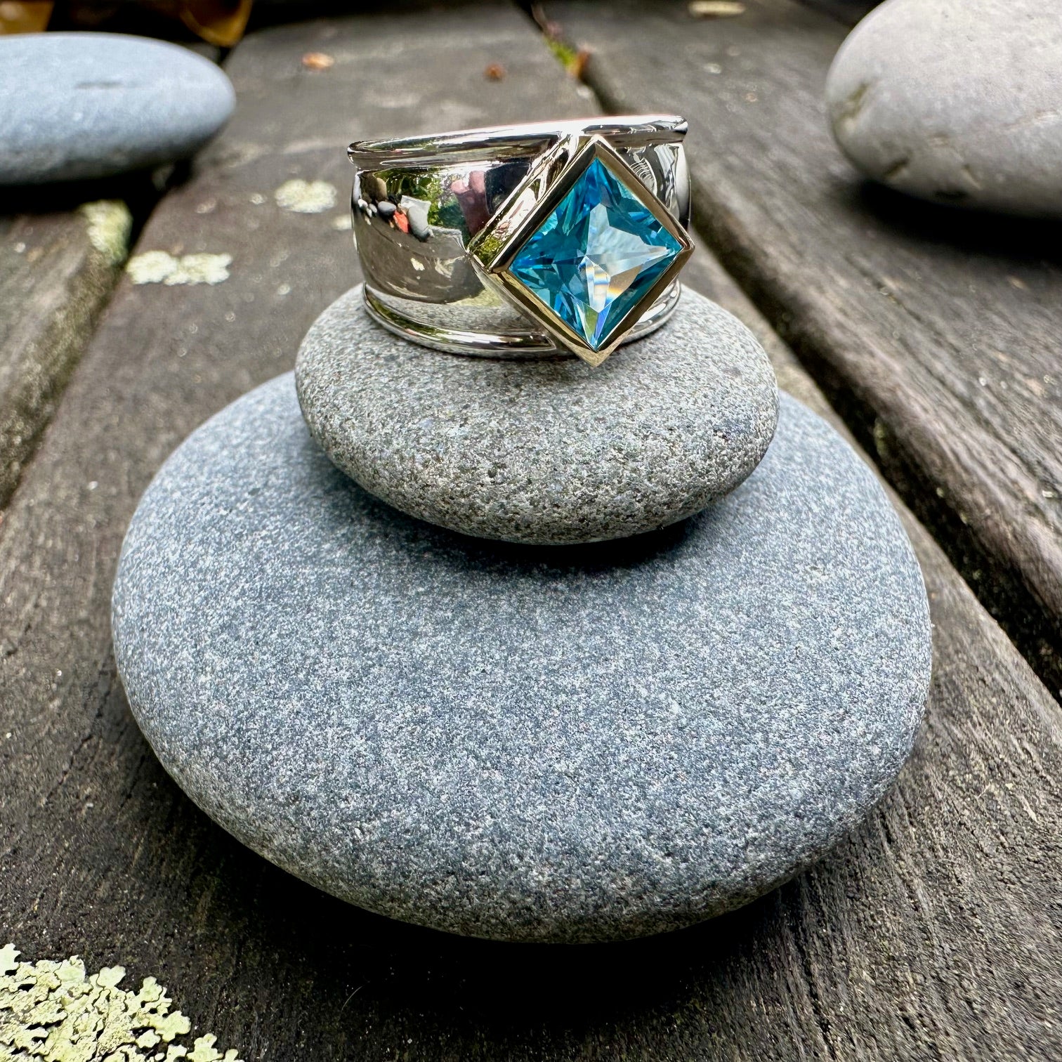 This fresh Swiss Blue topaz (princess cut) is set in a 9 carat yellow gold bezel with a wide sterling silver band.