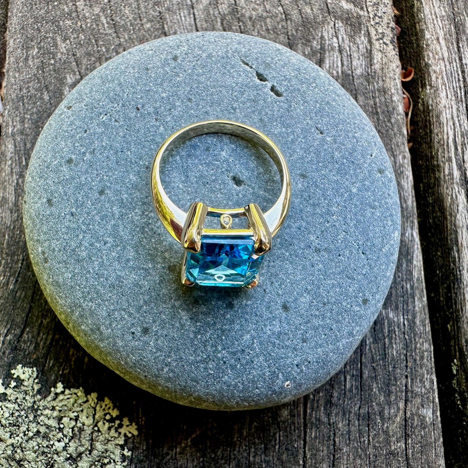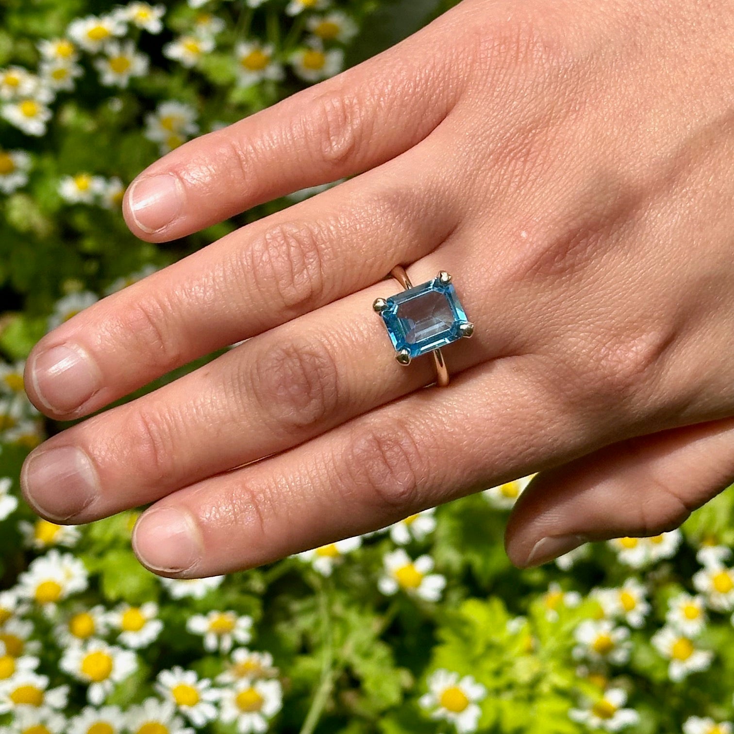 6.3ct Swiss blue topaz emerald cut ring with a tiny diamond set on either side of the claws & set in 9 ct yellow gold.