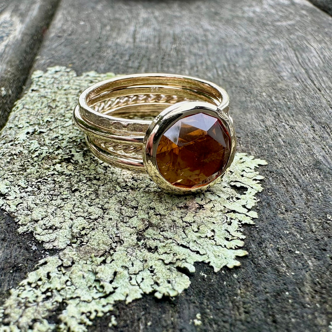 I created the unity ring during lockdown when there were so many people at odds with each other and I wanted a piece of jewellery which represents all the people we are and what we hold close to our hearts. In this case their are 4 9 carat yellow gold bands of differing textures which are bound together with a 3.37ct rose cut Brazilian citrine aroha band , which signifies the love which holds us & our precious ones together.