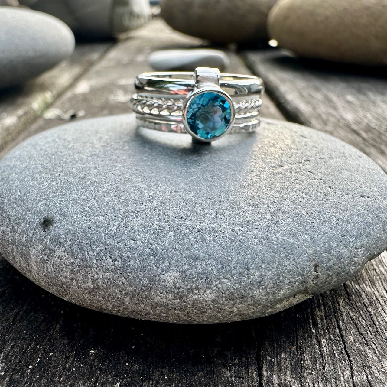 The unity ring was created during lockdown when there were so many people at odds with each other and I wanted a piece of jewellery which represents all the people we are and what we hold dear. In this case there are 4 bands of differing textures which are bound together with the sky blue topaz aroha band , which signifies the love which holds us together.