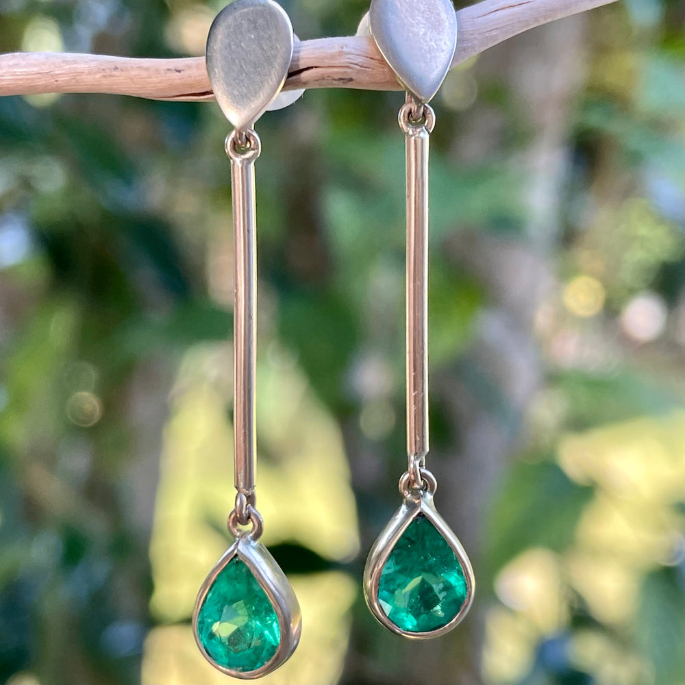 1.95ct Brazilian Emerald drop earrings in matte 9 carat yellow gold.