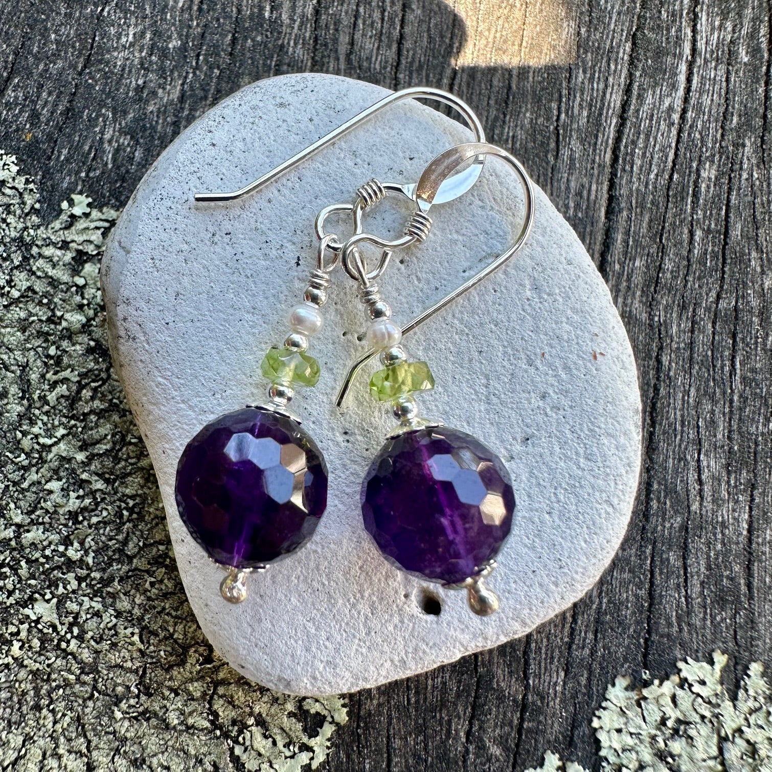 Beautiful 8mm rich cut royal amethyst with peridot & freshwater pearl in sterling silver.