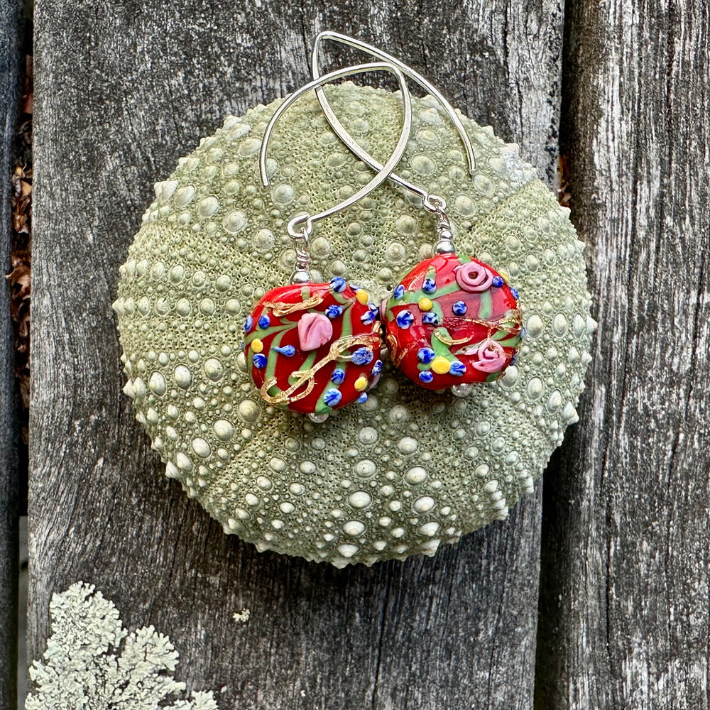 Bright red antique Venetian wedding glass earrings in sterling silver and on sterling marquis earwires.