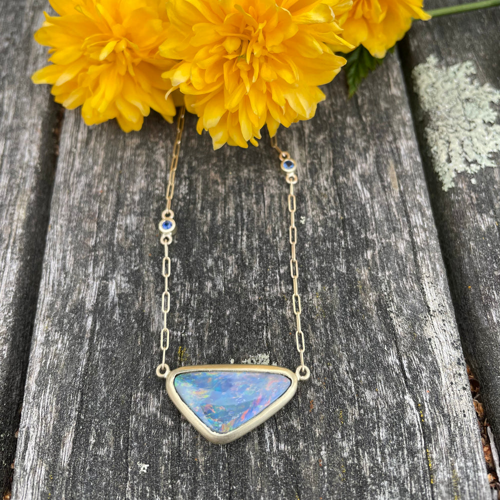 4.54 Ct Australian black opal with real fire inside. set in 14 carat gold with a matte finish and .15ct sapphires asymmetrically set.