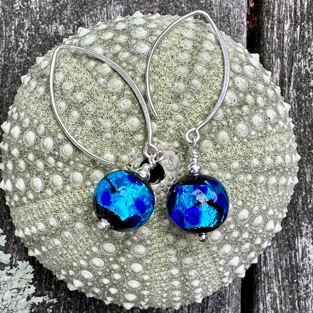 Bright blue Japanese lampwork earrings on sterling silver marquis hooks.