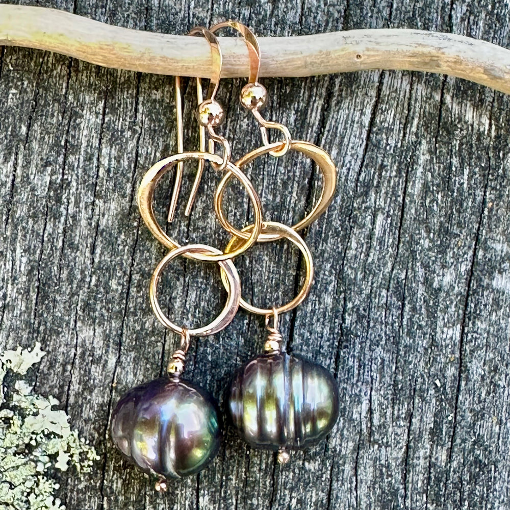 Peacock colour freshwater pearls earrings on double rose gold fill hoops.