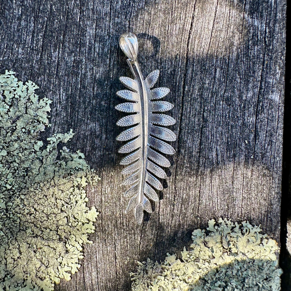 Medium sized silver fern pendant in sterling silver with tiny seed decoration.