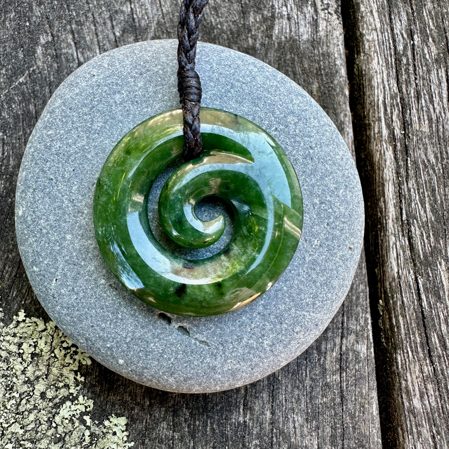 Beautiful NZ greenstone (pounamu) koru on a plaited adjustable cord.